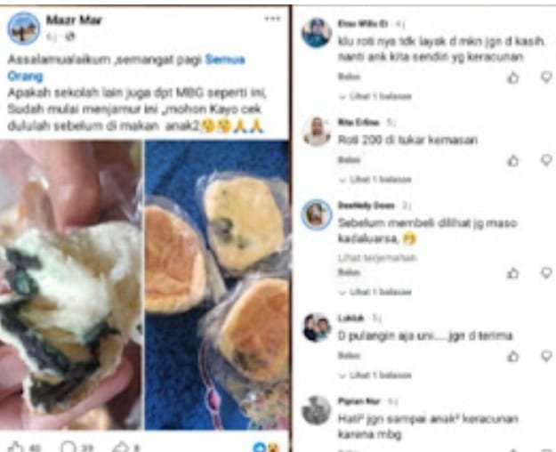 Warganet mempertanyakan kualitas makanan yang dibagikan, dengan beberapa komentar seperti “Semua roti berjamur cik.. kami pun dapat berjamur jugo” dan “Astaghfirullah maso Iyo makan bergizi lah berjamur, idak nian masuk akal.